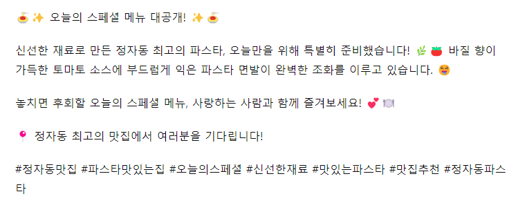 - ChatGPT 활용 설명: “오늘의 스페셜 메뉴는 신선한 재료로 만든 해산물 파스타입니다! 바다의 맛을 느낄 수 있는 이 특별한 요리를 놓치지 마세요. #해산물파스타 #오늘의스페셜 #맛집”